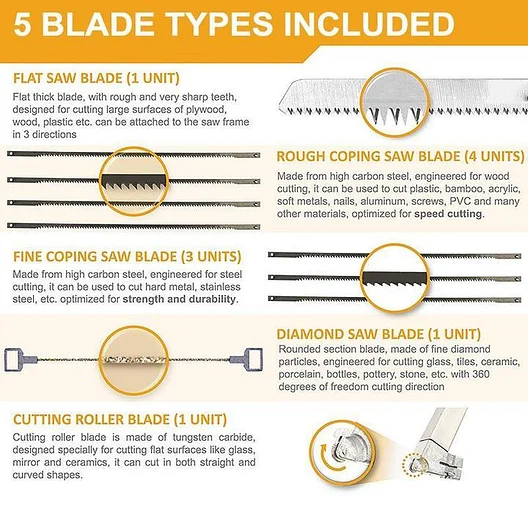 Saw body: the design of the groove with the glass outside, it can install different saw blades, it can be cut easily with the force of the hand, and the function of the curved saw can be realized without power supply.